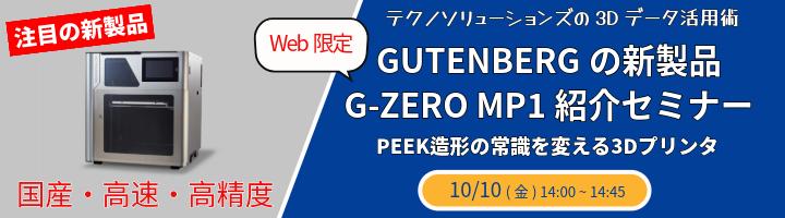 内容 | 【主なセミナー内容】 ◆GUTENBERGについて ◆新製品G-ZERO MP1 の見どころ ◆PEEK材の特長解説 ◆質疑応答 |