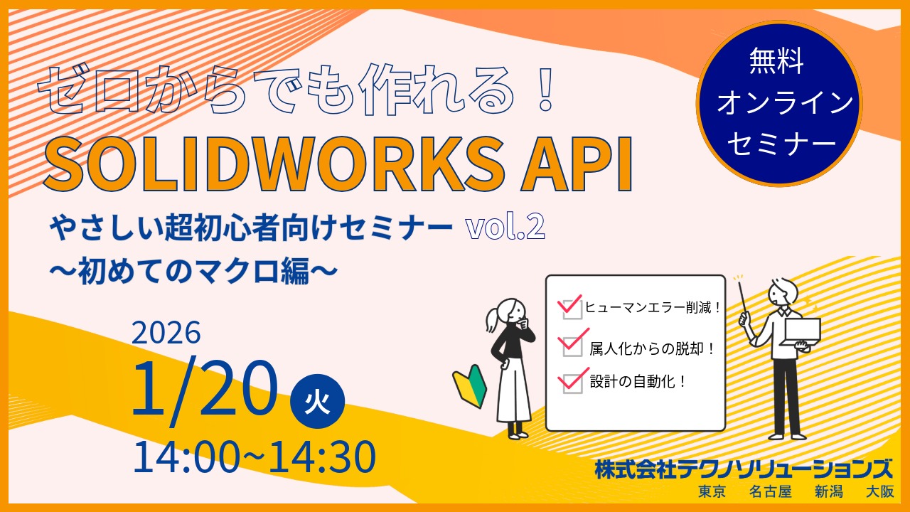 | 内容 | 【主なセミナー内容】 ・SOLIDWORKS API開発の事前準備フローをカンタン解説 ・初めての簡単なマクロ作成に挑戦 ・テクノソリューションズの SOLIDWORKS API サポートサービス紹介 ・Q&A |