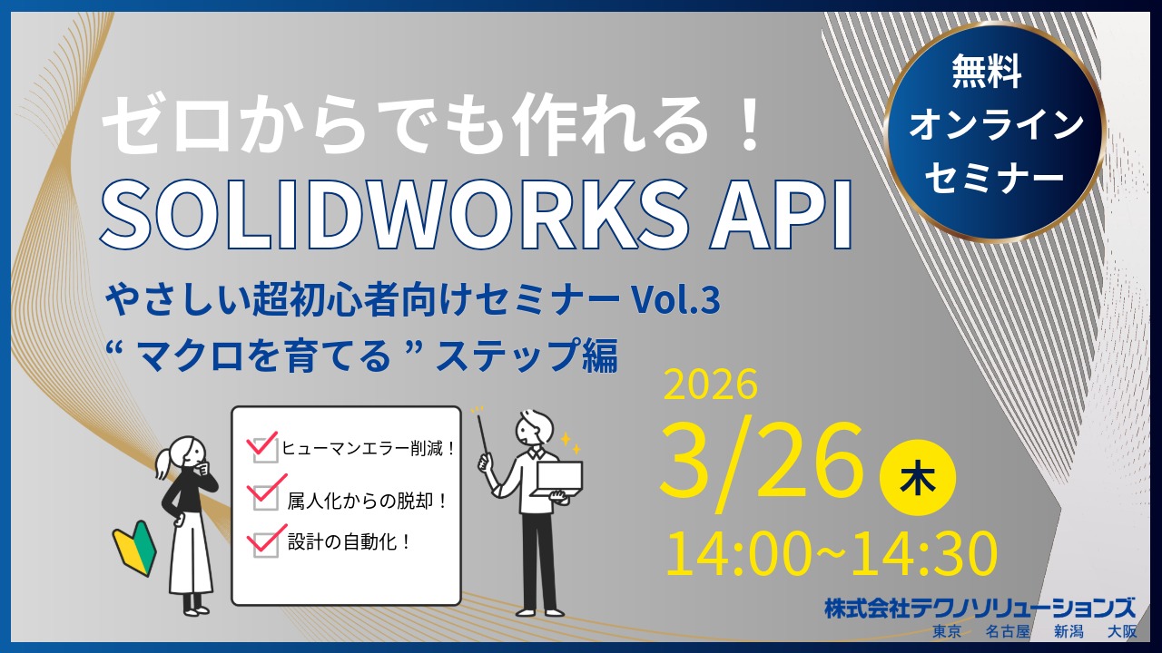 | 内容 | 【主なセミナー内容】 ・マクロを「育てる」という考え方と基本構成 ・処理完了メッセージなど、実務で役立つ機能追加の実演 ・テクノソリューションズの SOLIDWORKS API サポートサービス紹介 ・Q&A |