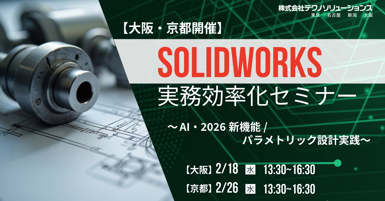 | 内容 | 【主な体験内容】 ◆SOLIDWORKS×AI 今使える機能とSOLIDWORKS AIの今後 ◆SOLIDWORKS2026+過去バージョン新機能 ◆パラメトリックモデリングとAPIで変わる現場効率化 ◆SOLIDWORKSユーザー様向けお役立ちセッション 板金編 ◆テクノソリューションズのサービスご案内 |